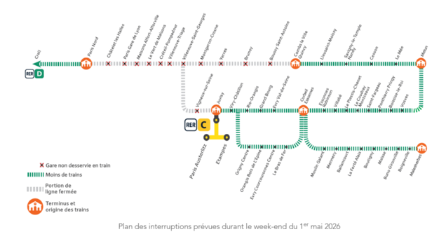 [Information mise à jour !] Du samedi soir jusqu’au dimanche à 5h35, le trafic est interrompu entre Paris Gare de Lyon et Combs la Ville – Quincy.