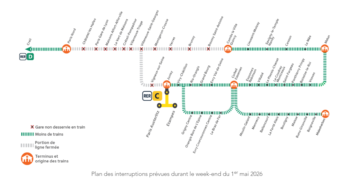 Durant tout le week-end, moins de trains circulent entre Goussainville et Melun dans les 2 sens.