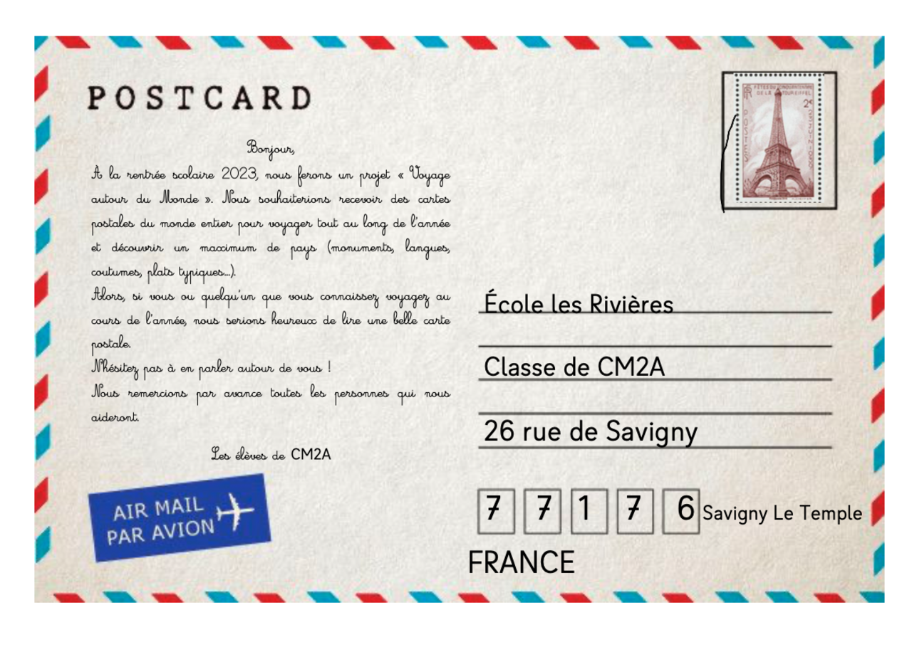 ✉️ L'adresse pour envoyer votre carte postale : Ecole des Rivières, classe de CM2A - 26 rue de Savigny - 77176 Savigny-le-Temple
