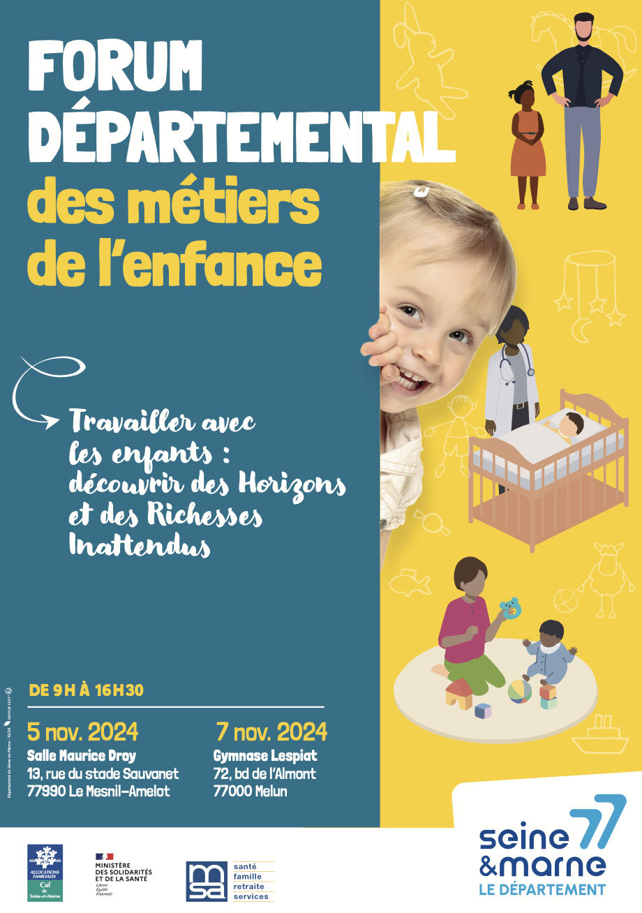 Le forum départemental des métiers de l'enfance se tiendra le 5 novembre 2024 à la salle Maurice Roy au Mesnil Amelot, puis le 7 novembre 2024 au gymnase Lespiat à Melun, de 9h à 16h30.