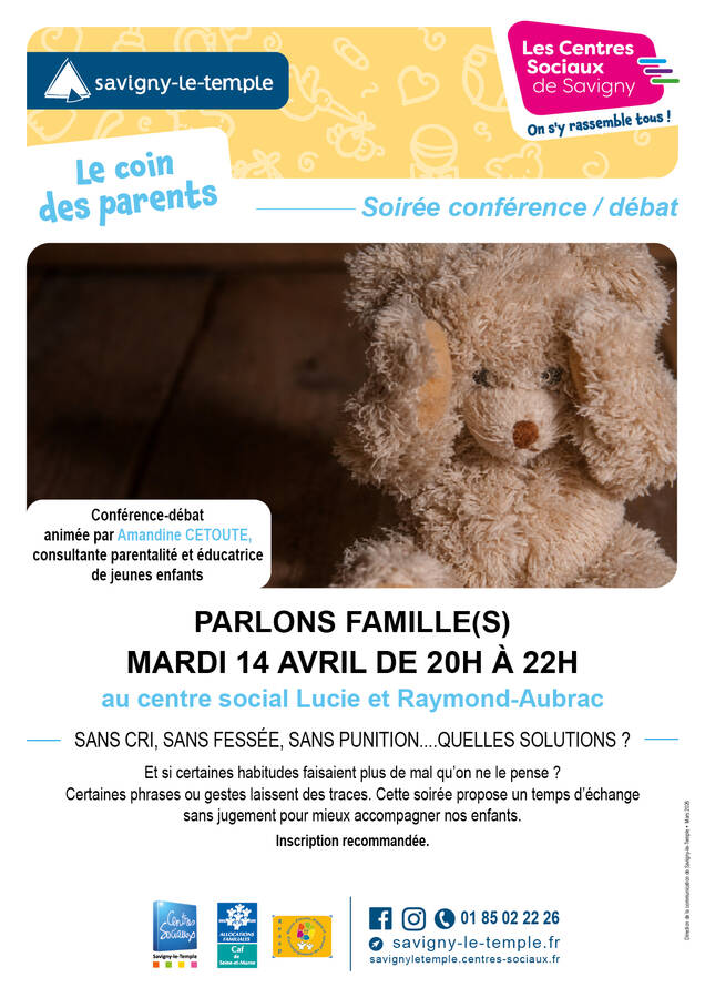 Mardi 14 avril, de 20h à 22h au centre social Lucie et Raymond-Aubrac, une soirée d’échanges est proposée aux parents autour de la thématique : SANS CRI, SANS FESSÉE, SANS PUNITION.. QUELLES SOLUTIONS ? Et si certaines habitudes faisaient plus de mal qu'on ne le pense ? Certaines phrases ou gestes laissent des traces.