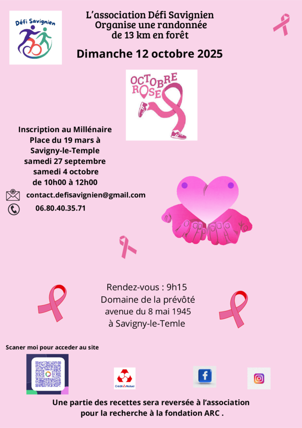Le Défi Savignien est heureux de vous inviter à "Octobre Rose", une randonnée de 13 km au cœur de la forêt. Rejoignez-nous le dimanche 12 octobre 2025 à 9h15 au au Domaine de la Grange-la-Prévôté pour cette aventure solidaire et sportive.