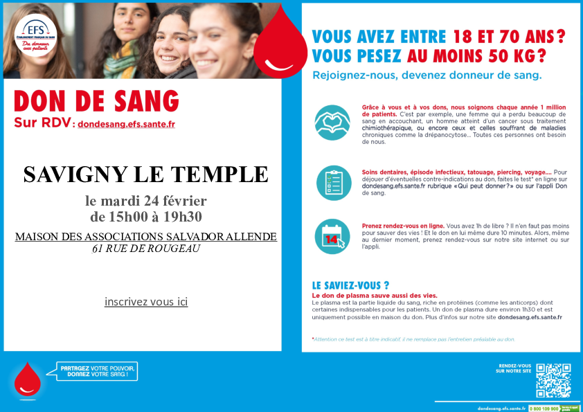 L’Établissement Français du Sang vous donne rendez-vous le mardi 24 février de 15h à 19h30 à la Maison des associations Salvador Allende, rue de Rougeau, pour donner votre sang !