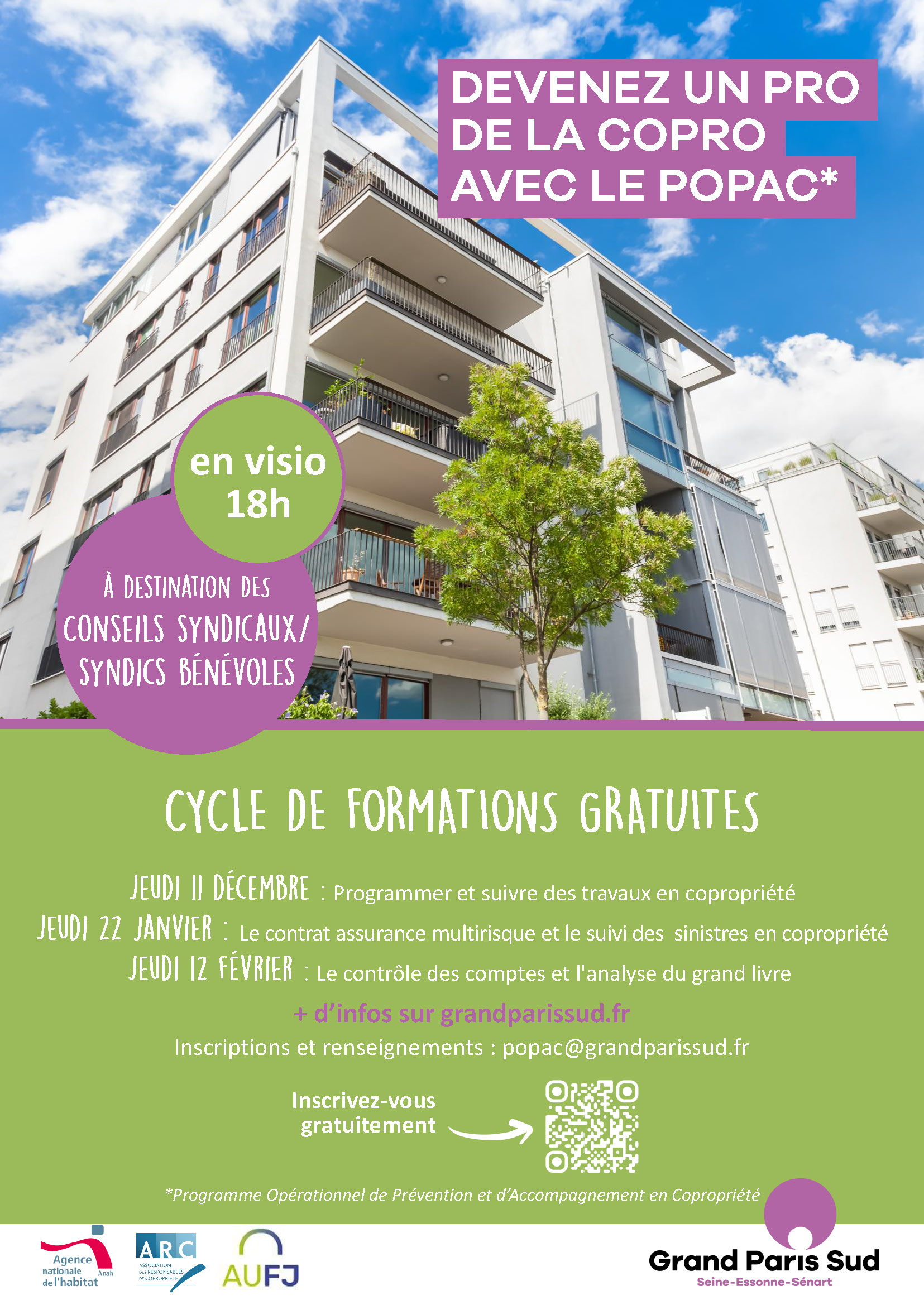 Pour tout renseignement complémentaire, vous pouvez nous écrire sur l'adresse mail suivante : popac@grandparissud.fr et suivre le calendrier des formations du POPAC sur le site internet de Grand Paris Sud : https://www.grandparissud.fr/vivre-ici/logement/votre-logement-et-lagglomeration/vous-etes-coproprietaires-des-conseils-et-formations-peuvent-vous-interesser/