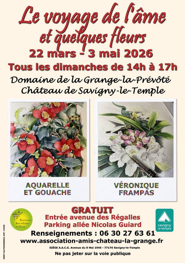 Venez visiter l'exposition d'aquarelles sur le thème "Le voyage de l'âme et quelques fleurs" du dimanche 22 mars au dimanche 3 mai 2026 de 14h à 17h au domaine de la Grange.