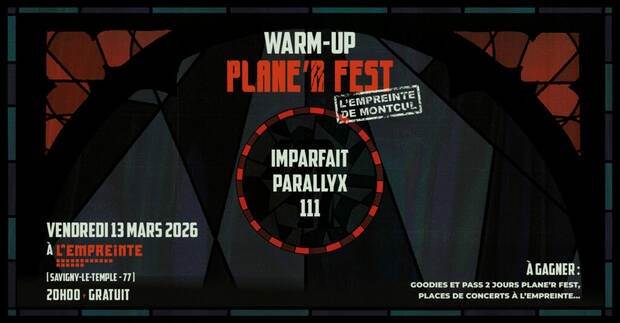 Le concert de WARM UP PLANE R FEST : IMPARFAIT + PARALLYX + 111, se déroulera le vendredi 13 mars de 20h à 23h30 à l'Empreinte.