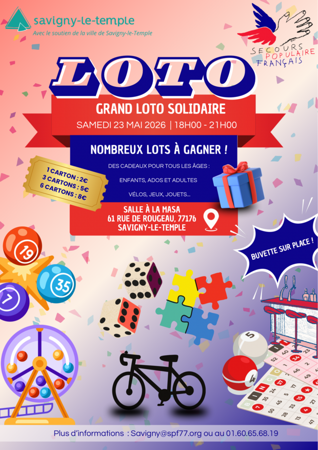 Venez participer au grand loto solidaire organisé par le secours populaire Français, le samedi 23 mai de 18h à 21h à la maison des associations.