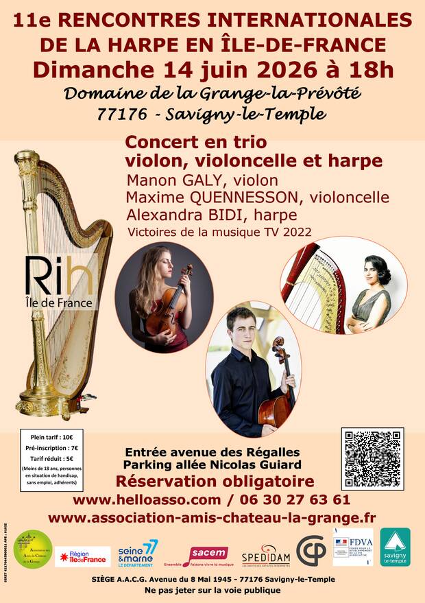 Dans le cadre de la 11e édition des Rencontres Internationales de la Harpe en Île-de-France, nous vous proposons un concert de violon, violoncelle et harpe : trois jeunes musiciens talentueux (master Conservatoires nationaux supérieurs de musique, lauréats de concours internationaux et Victoire de la musique 2022) vous séduiront en vous offrant un programme issu de divers horizons musicaux. Avec la harpiste Alexandra Bidi, la violoniste Manon Galy et le violoncelliste Maxime Quennesson.
