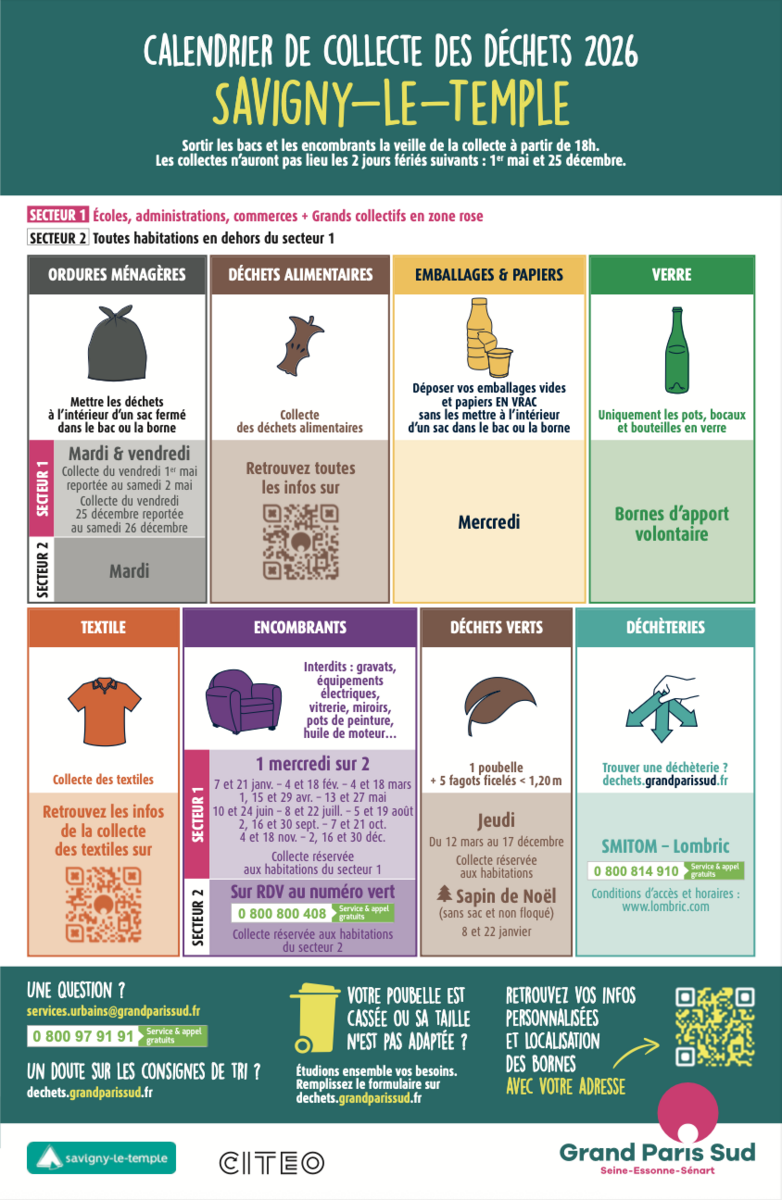 - Les poubelles sont à sortir la veille des collectes à partir de 18h. Les collectes ne seront pas assurées les 2 jours fériés suivants : 1er mai (reporté au samedi 2 mai), 25 décembre 2026 (reporté au samedi 26 décembre).